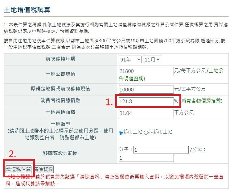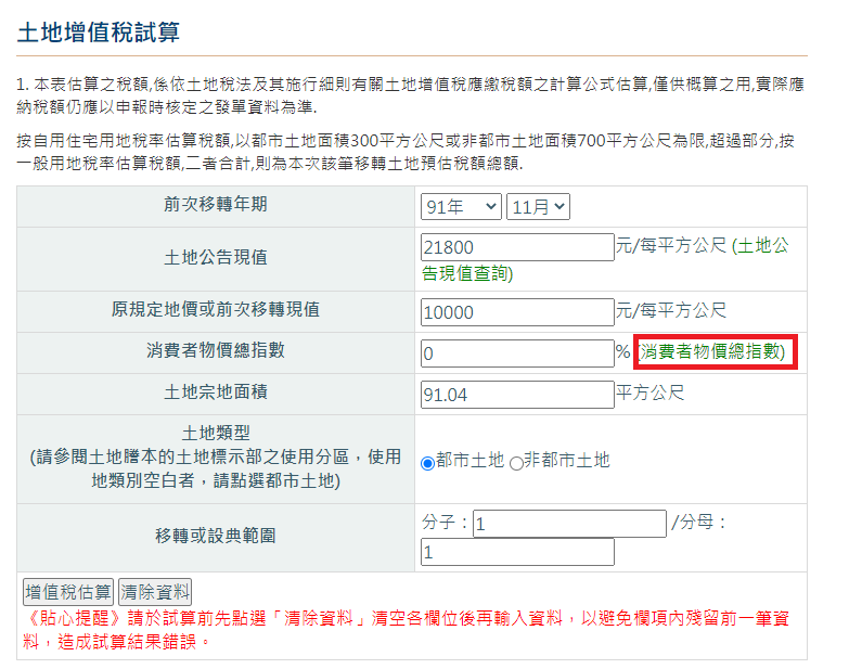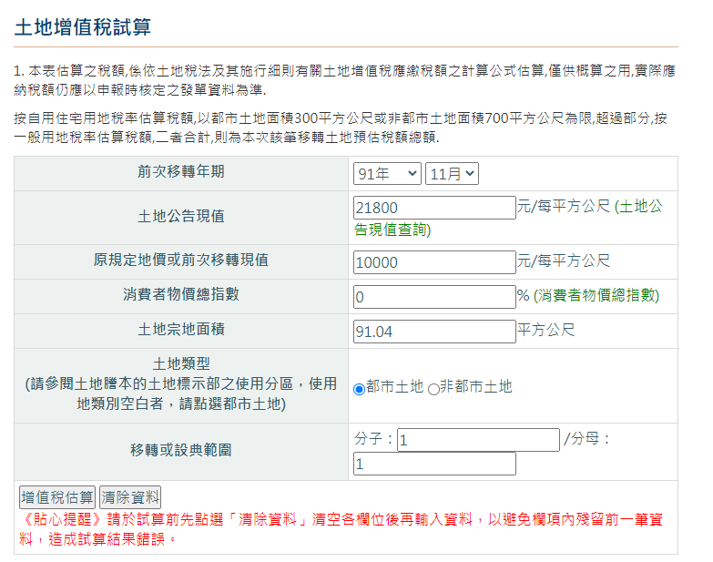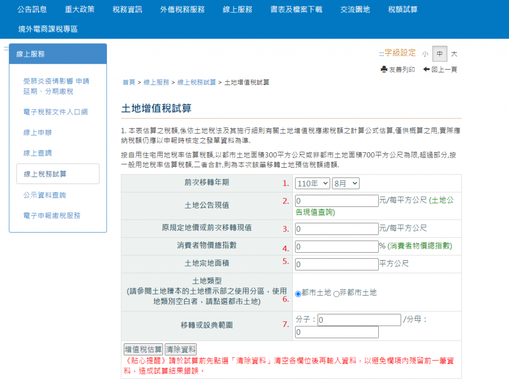 點選線上稅務試算-土地增值稅試算 – 財政部稅務入口網